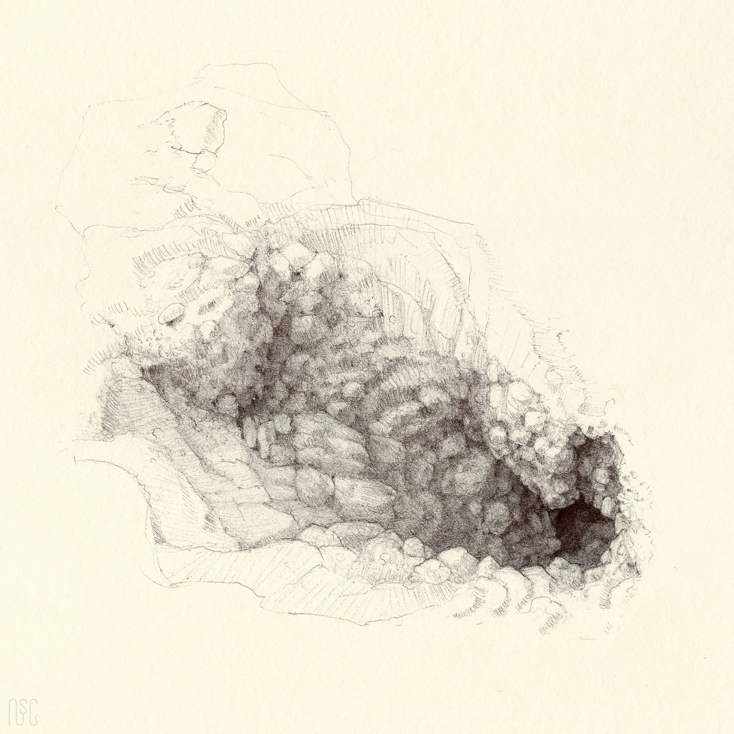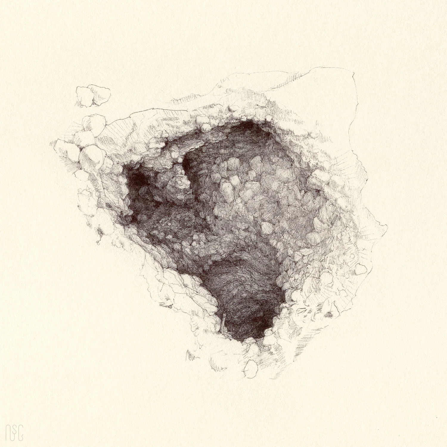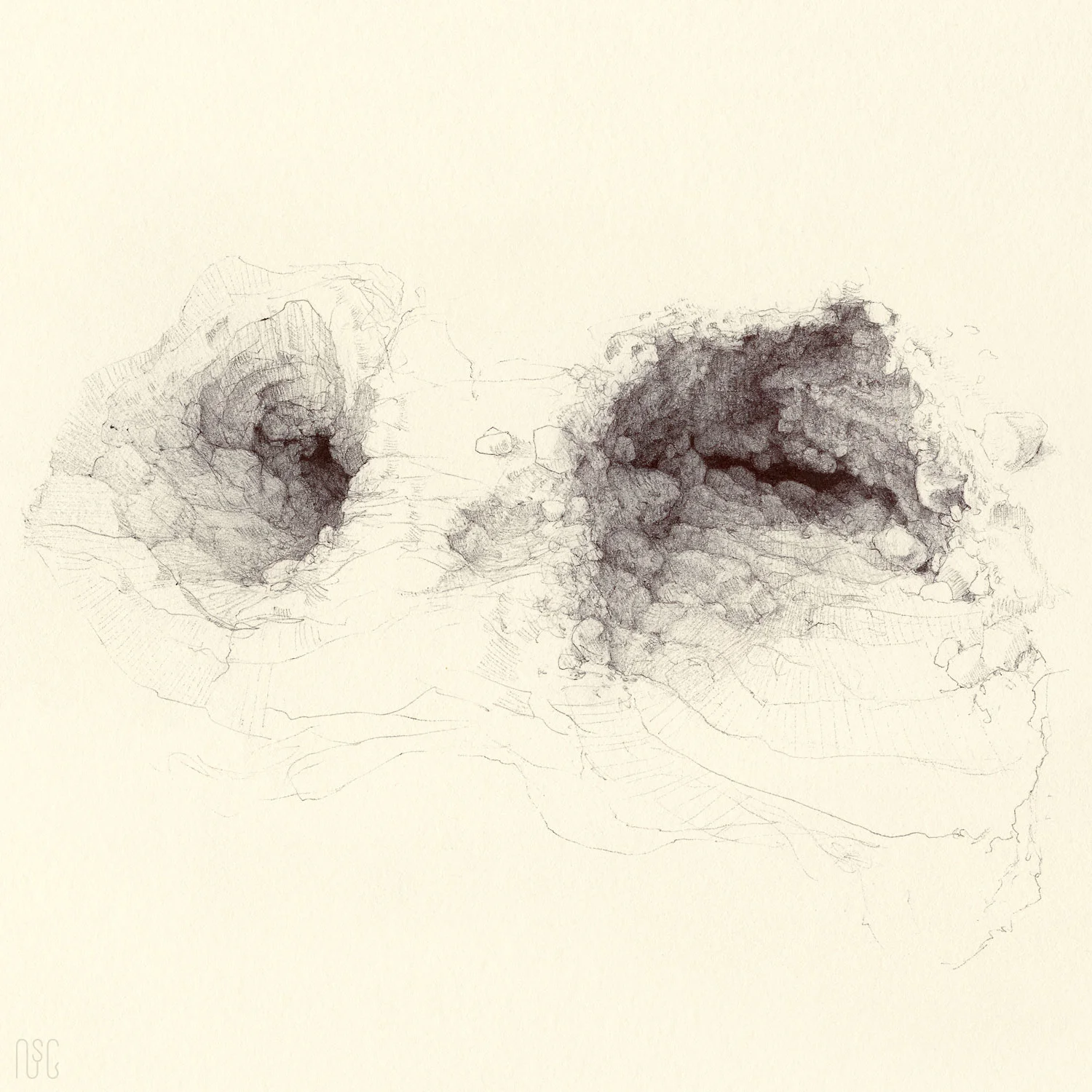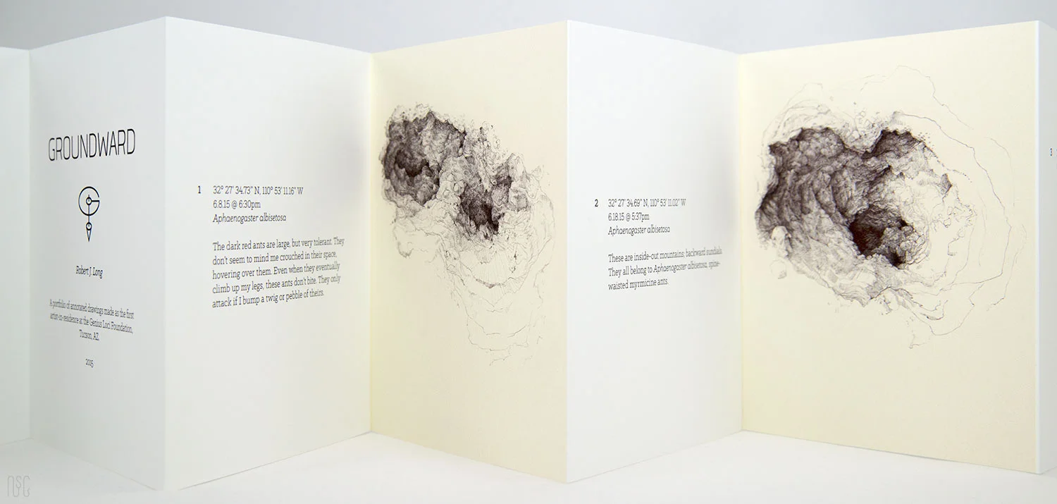 The ants’ caves are shape-shifters with the changing light. Those drawn in the morning appear to change dimensions in the evening, but flatten-out when the sun is overhead. The long cliffs flanking this nest are made visible by the shadows cast by the morning sun coming in from my right, but would be hidden in the evening light coming in from my left.