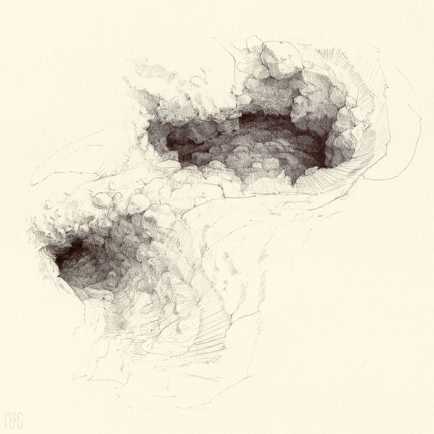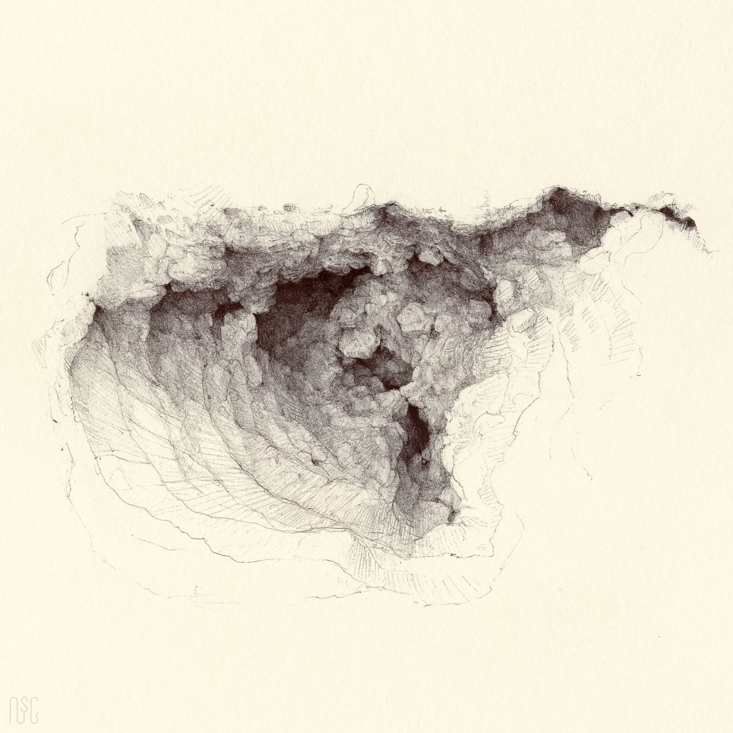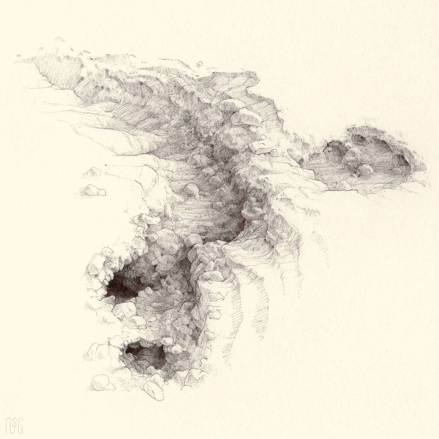 The ants’ caves are shape-shifters with the changing light. Those drawn in the morning appear to change dimensions in the evening, but flatten-out when the sun is overhead. The long cliffs flanking this nest are made visible by the shadows cast by the morning sun coming in from my right, but would be hidden in the evening light coming in from my left.