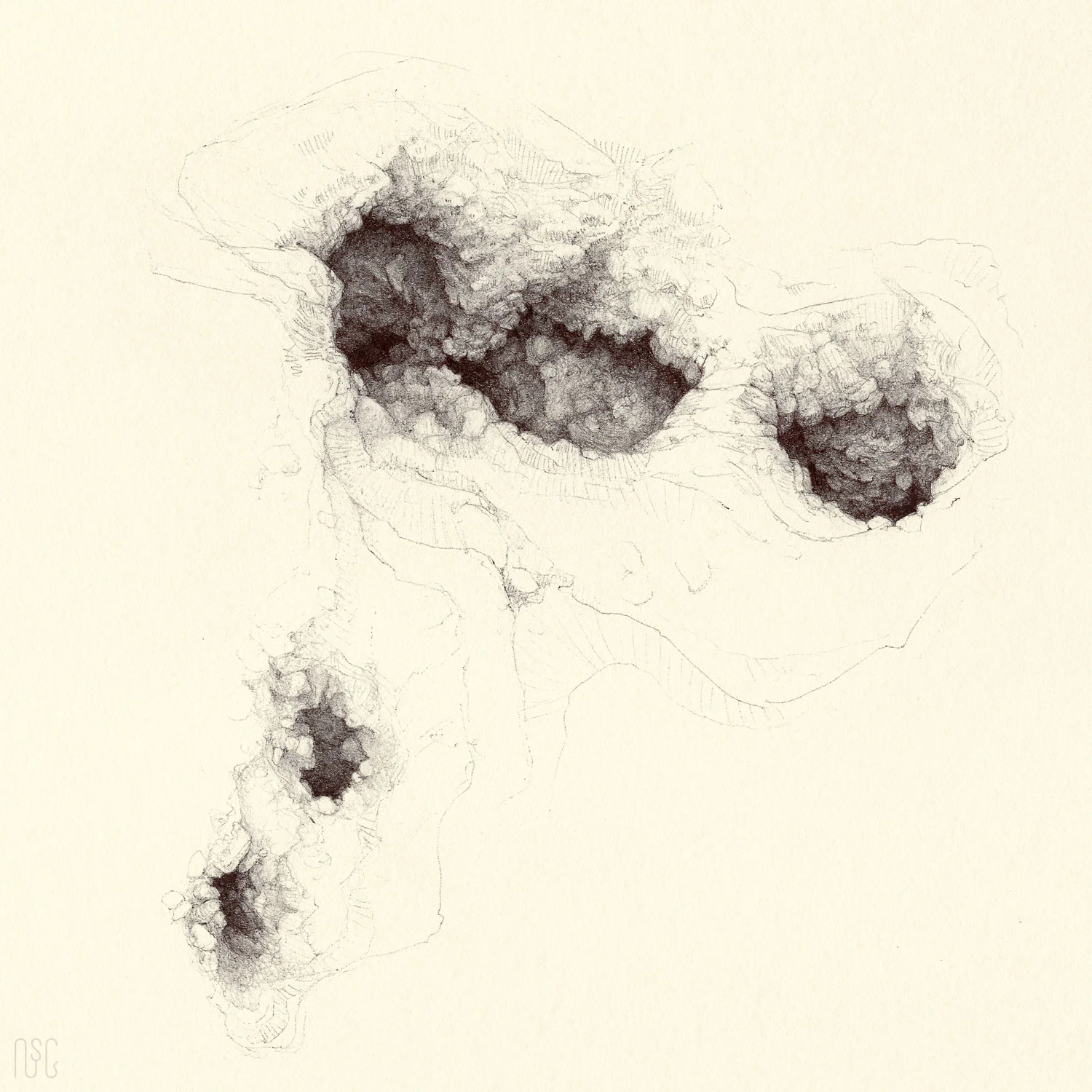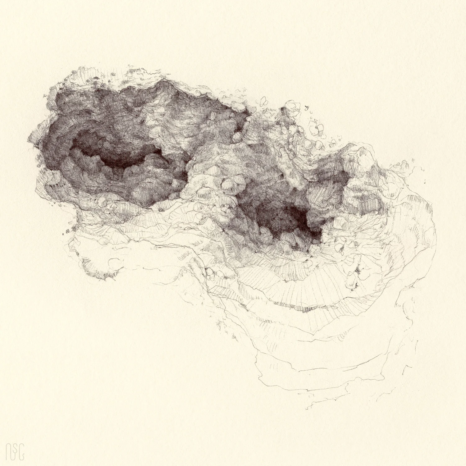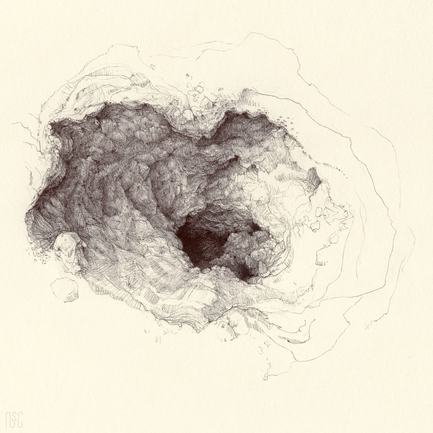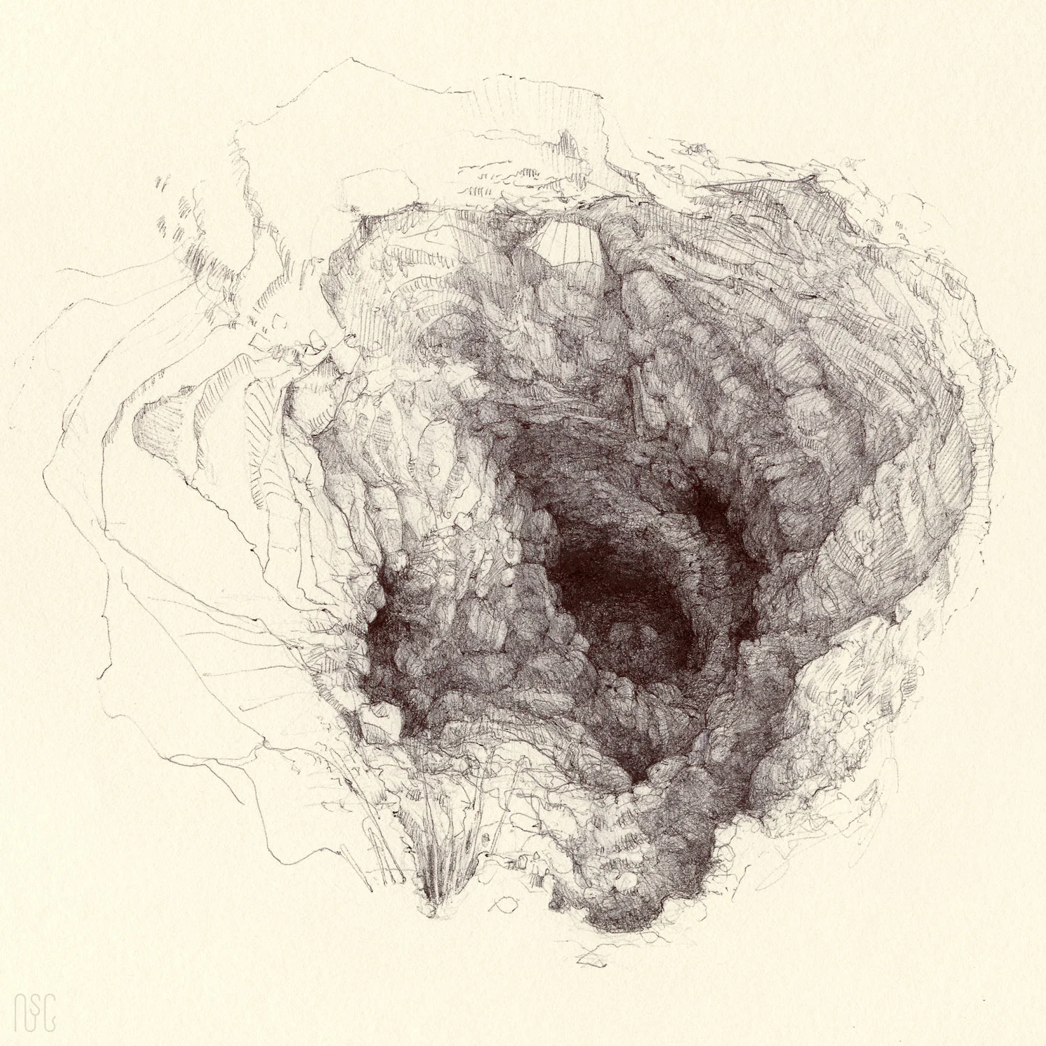 The ants’ caves are shape-shifters with the changing light. Those drawn in the morning appear to change dimensions in the evening, but flatten-out when the sun is overhead. The long cliffs flanking this nest are made visible by the shadows cast by the morning sun coming in from my right, but would be hidden in the evening light coming in from my left.