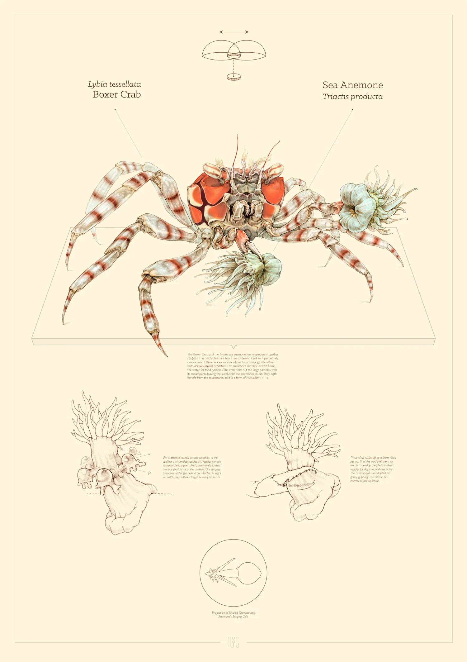 "Those of us taken up by a Boxer Crab get our fill of the crab’s leftovers, so we don’t develop the photosynthetic vesicles for daytime food-production. The crab’s claws are adapted for gently gripping us, as it is in his interest to not squish us."