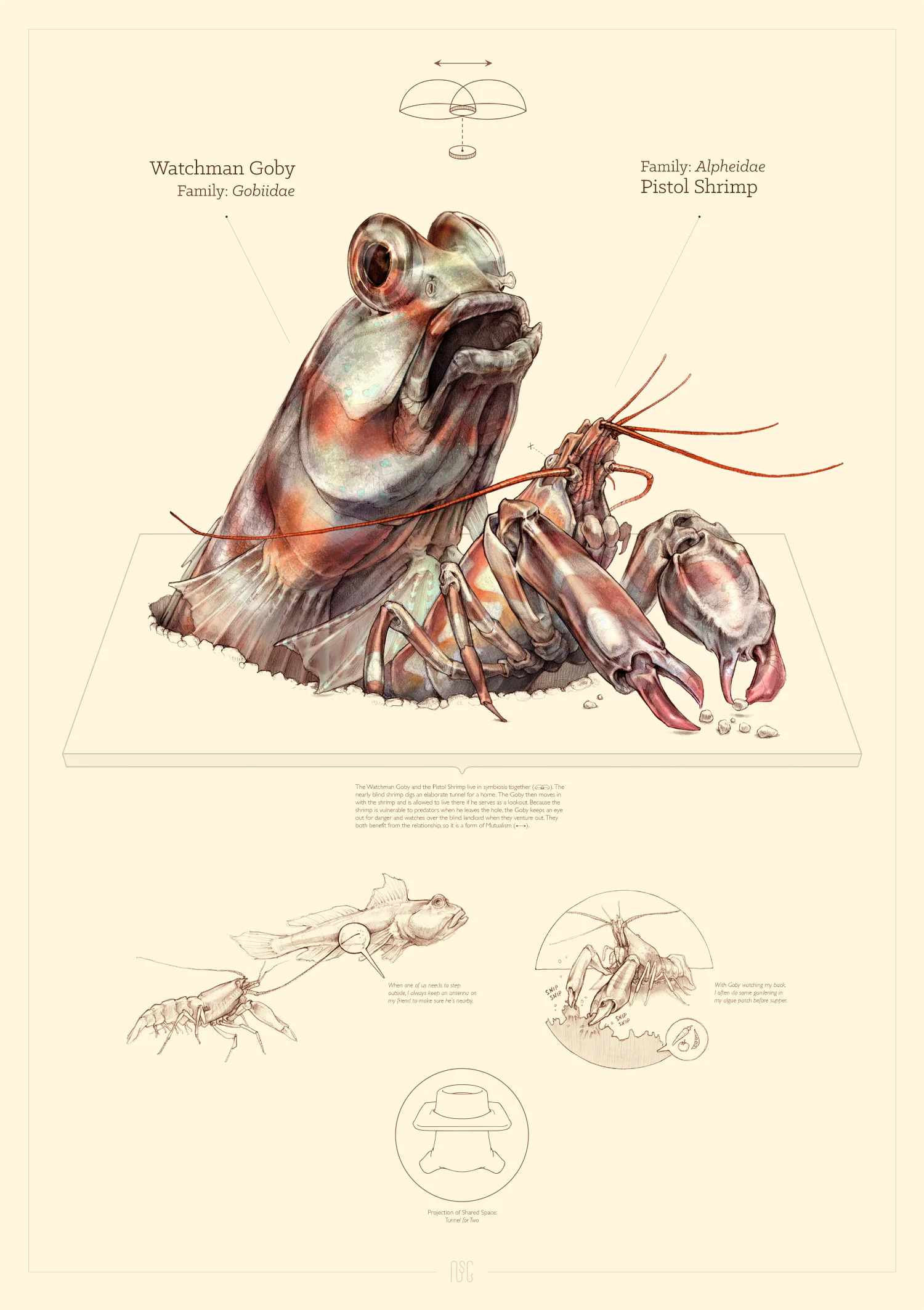 Uexküll holds that the self-world, or the Umwelt, emanates from every organism’s sense organs and represents the extent of its sensory field. The overlap of two animals’ respective Umwelten is the site I extract for investigation, as denoted by the icon above each illustration of intimate interspecies relationships. Each pair of animals exhibits symbiosis: the living together of unlike organisms.