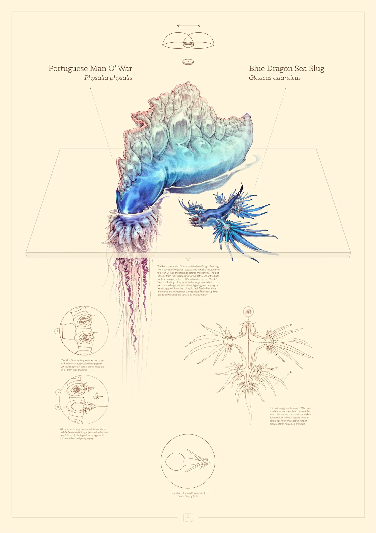 The Portuguese Man O’ War and the Blue Dragon Sea Slug live in symbiosis together. The parasitic slug feeds on the Man O’ War and steals its defense mechanisms. The slug benefits from their relationship to the detriment of the host, so they exemplify a form of Parasitism. The Man O’ War is a floating colony of individual organisms called zooids, each of which specializes in either digesting, reproducing, or paralyzing prey. Atop the colony is a sail filled with carbon monoxide and nitrogen for staying afloat. The sea slug floats upside-down along the surface by swallowing air.