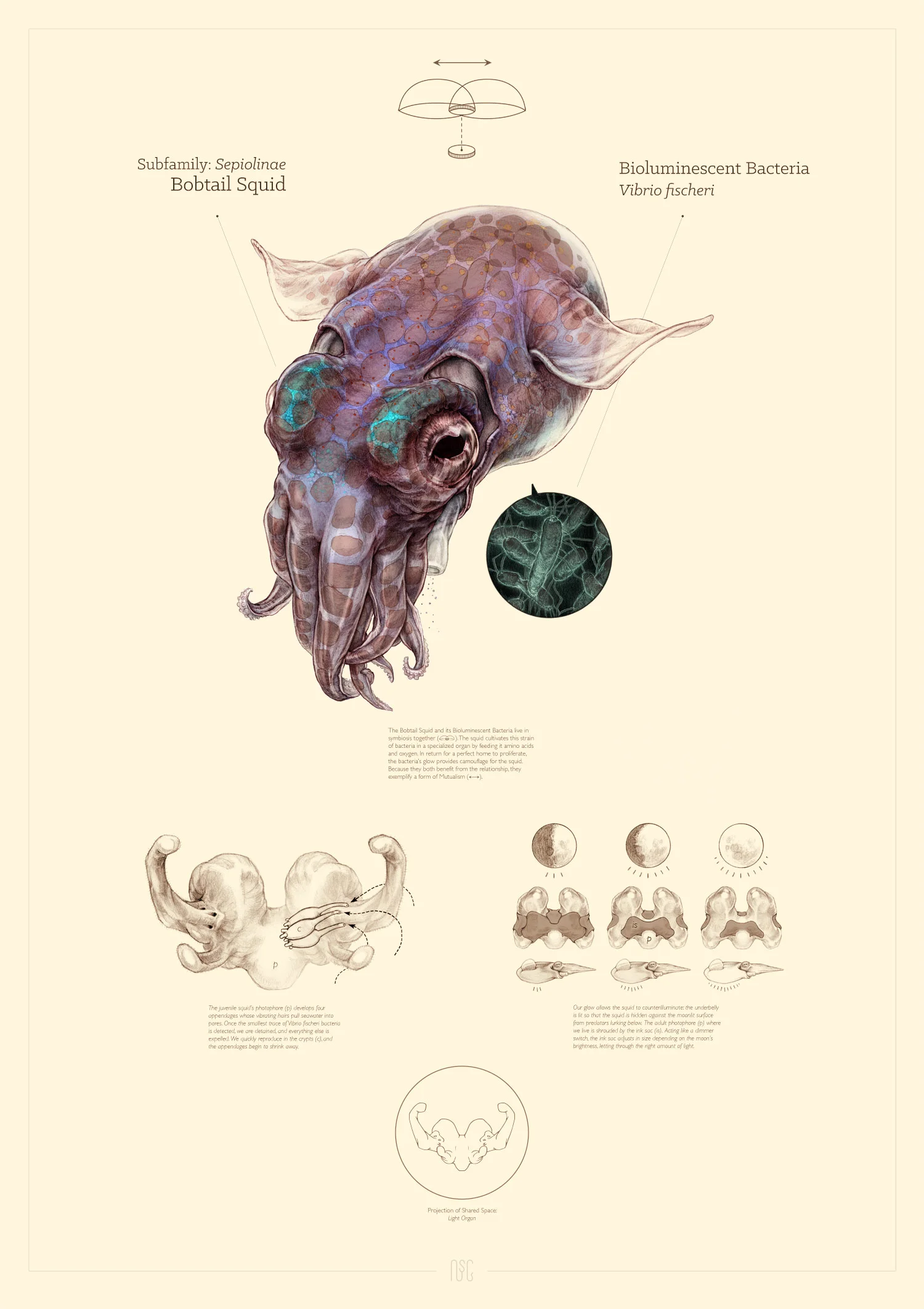 The Bobtail Squid and its Bioluminescent Bacteria live in symbiosis together. The squid cultivates this strain of bacteria in a specialized organ by feeding it amino acids and oxygen. In return for a perfect home to proliferate, the bacteria’s glow provides camouflage for the squid. Because they both benefit from the relationship, they exemplify a form of Mutualism.